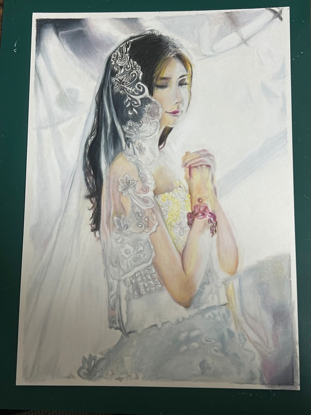色鉛筆で描いています。 祈りを捧げるようでもあり、これからの幸福を願うような姿にもみえます。 見た方がどう感じるのか その時々の気分で変わって見える絵に仕上げました。 良き出会いになりますように 原画のみの販売となります。 サイズ:B5