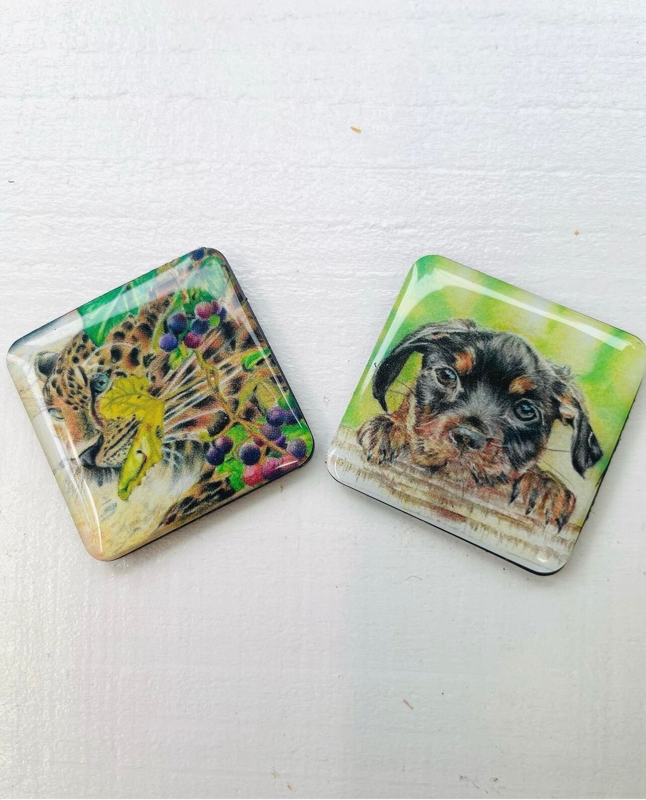 犬のみの販売となります。 サイズ:3cm✖️3cm マグネット 表面ビニール加工 艶のある可愛らしい子犬 よき出会いに化ますように
